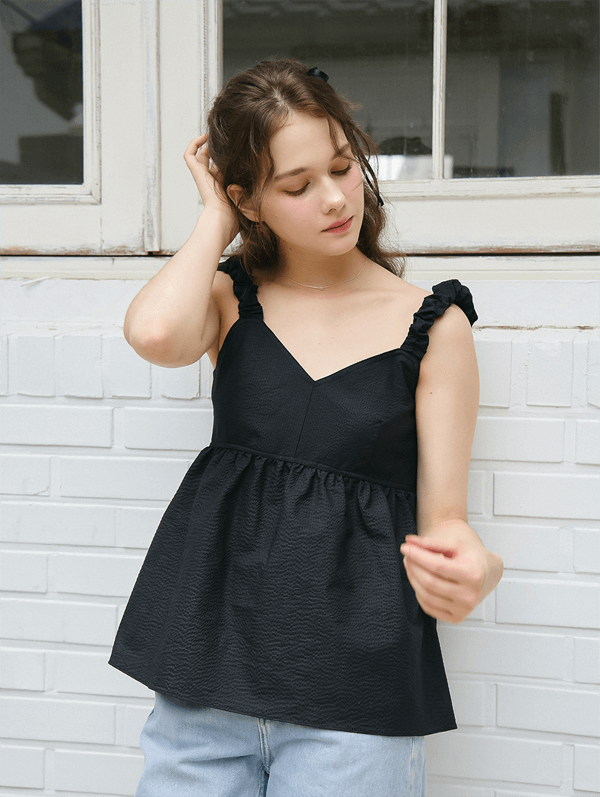 - 어깨끈의 고무줄을 이용한 셔링 디테일이 포인트가 되어줌